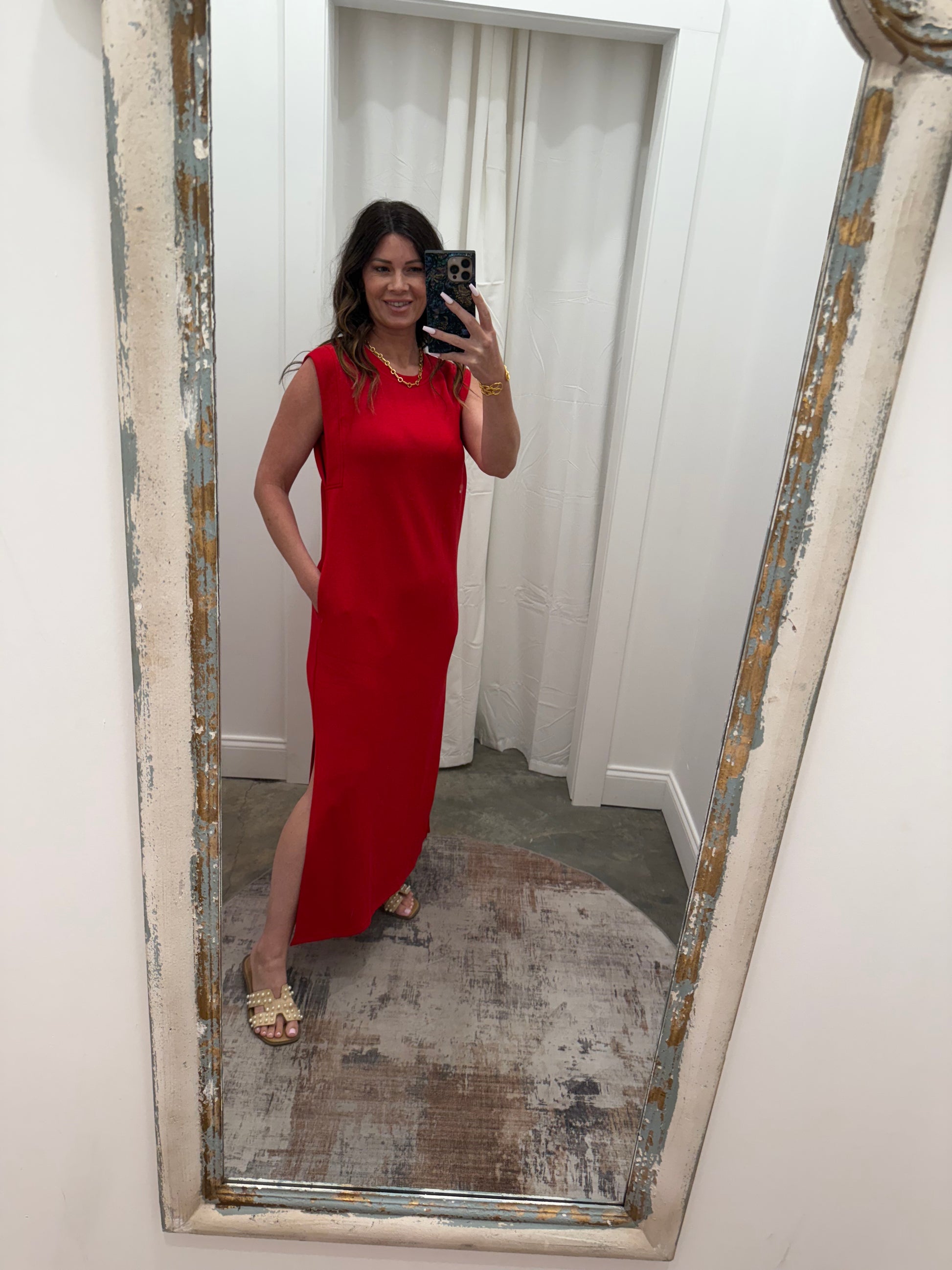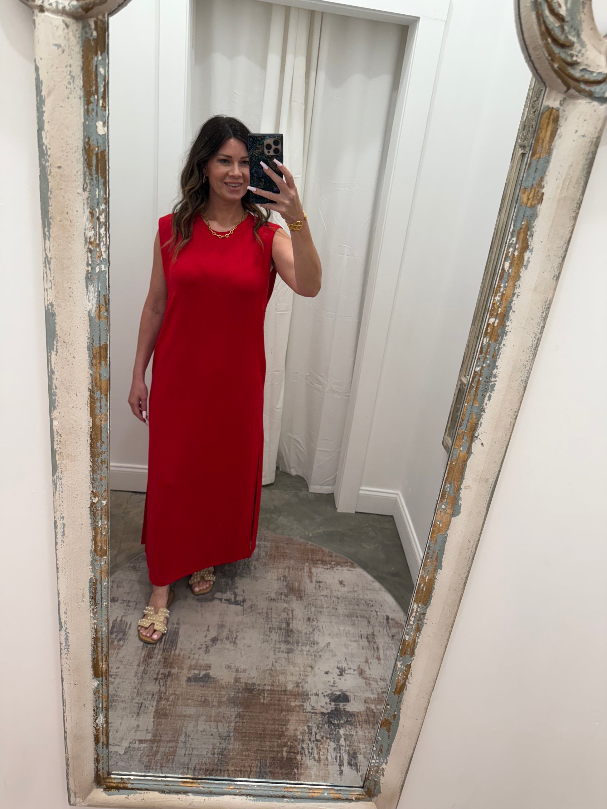 Turn heads with this vibrant red sleeveless maxi dress, featuring a sleek silhouette and subtle side slit. Perfect for an elegant evening out or a stylish summer gathering.