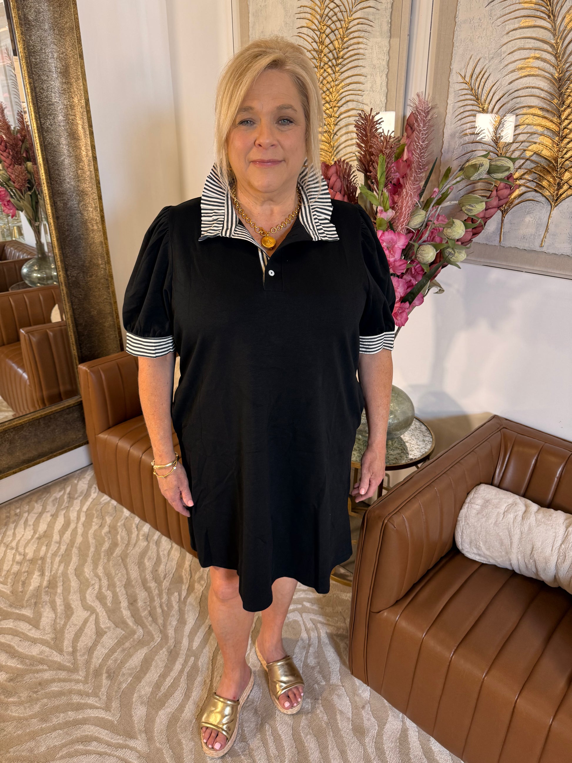 Elevate your everyday with this black dress featuring playful puff sleeves and a striking striped collar. Its relaxed fit and soft fabric make it perfect for casual outings or brunch with friends.
