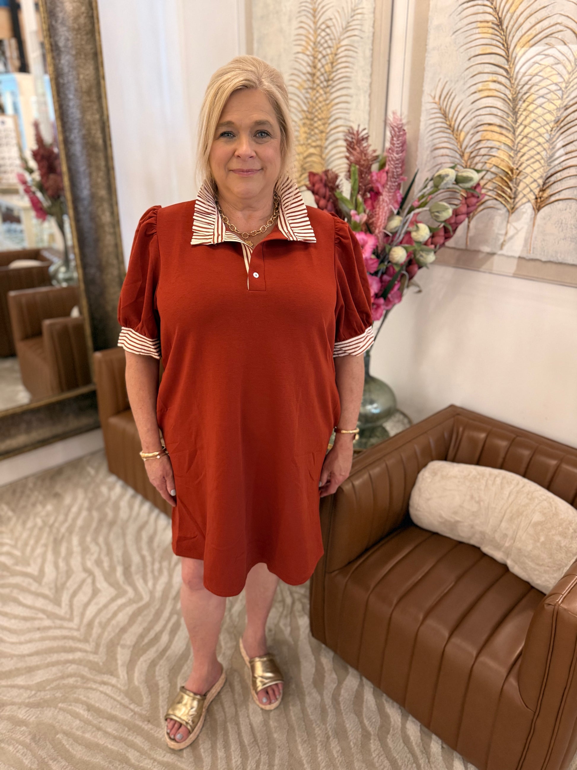 Elevate your wardrobe with this rust-hued dress featuring playful puff sleeves and a striped collar. Crafted for comfort and style, it's perfect for casual outings or brunch dates, adding a touch of effortless elegance to your ensemble.
