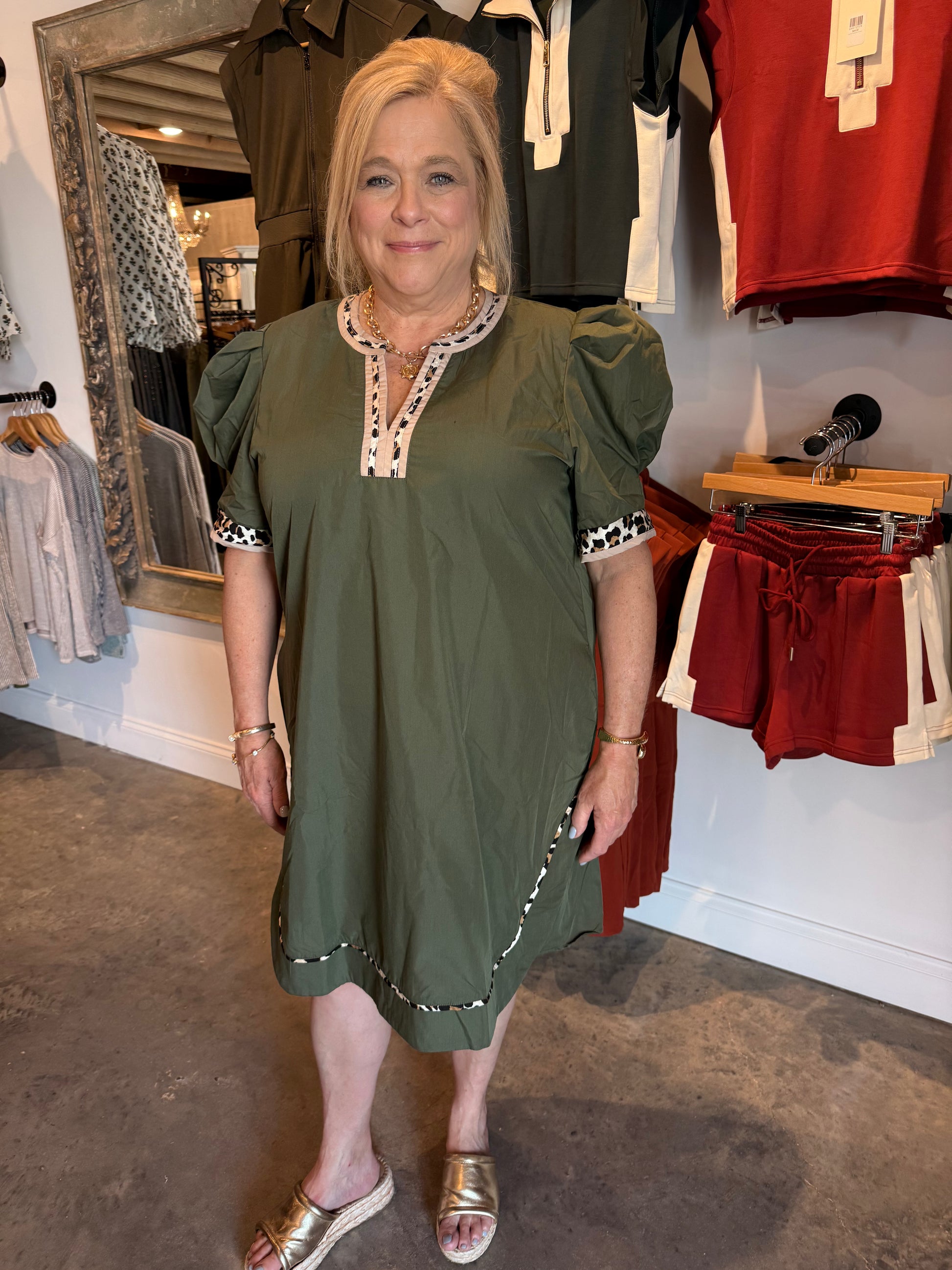This elegant olive green dress features playful puff sleeves and striking animal print trim, offering a relaxed silhouette perfect for brunches or casual outings. The lightweight fabric ensures comfort and effortless style.