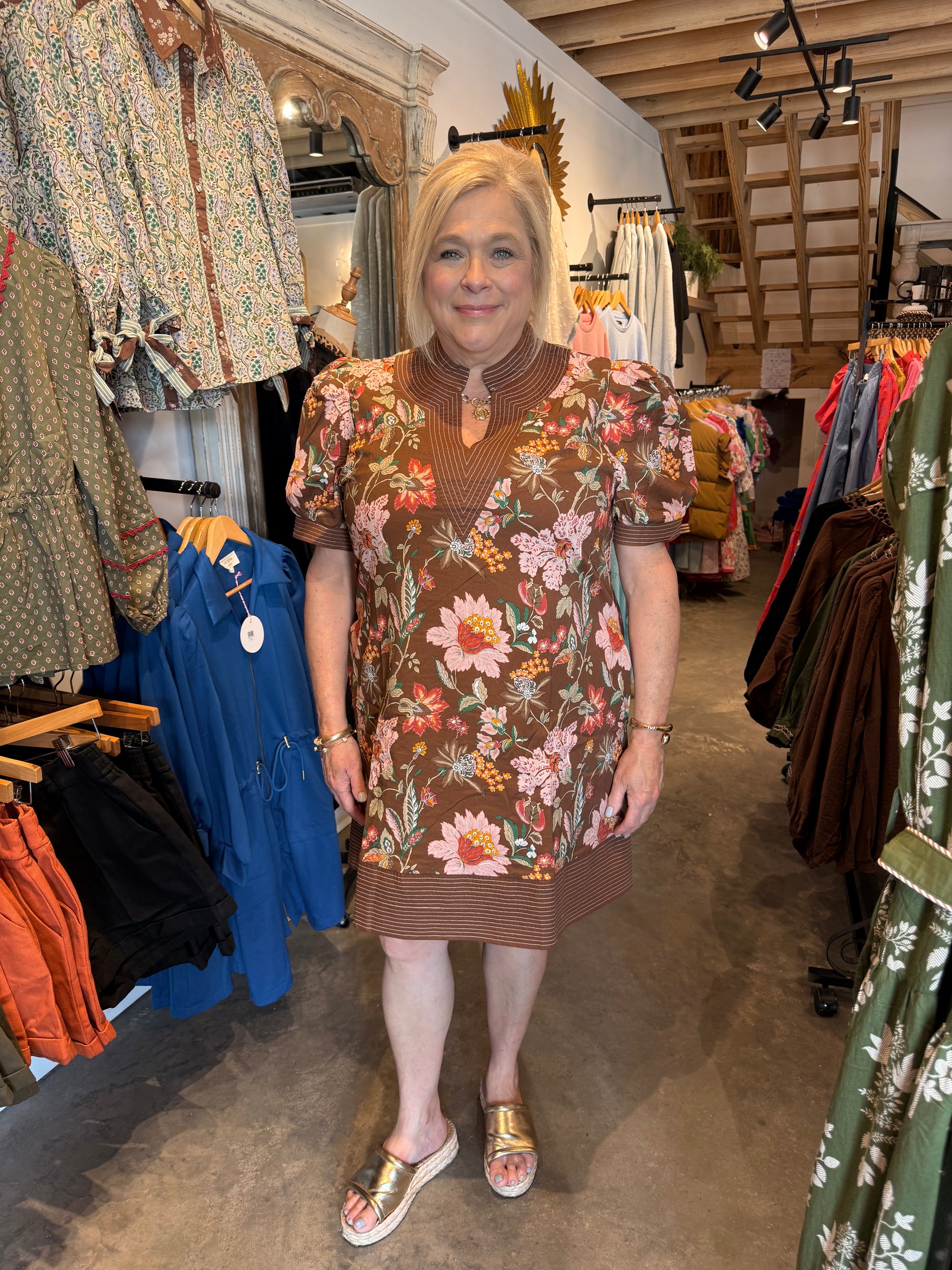 Embrace effortless elegance with this floral dress, featuring a rich brown hue and eye-catching puff sleeves. The soft, structured fabric and intricate patterns make it perfect for brunches or garden parties, adding a touch of vintage charm to any occasion.