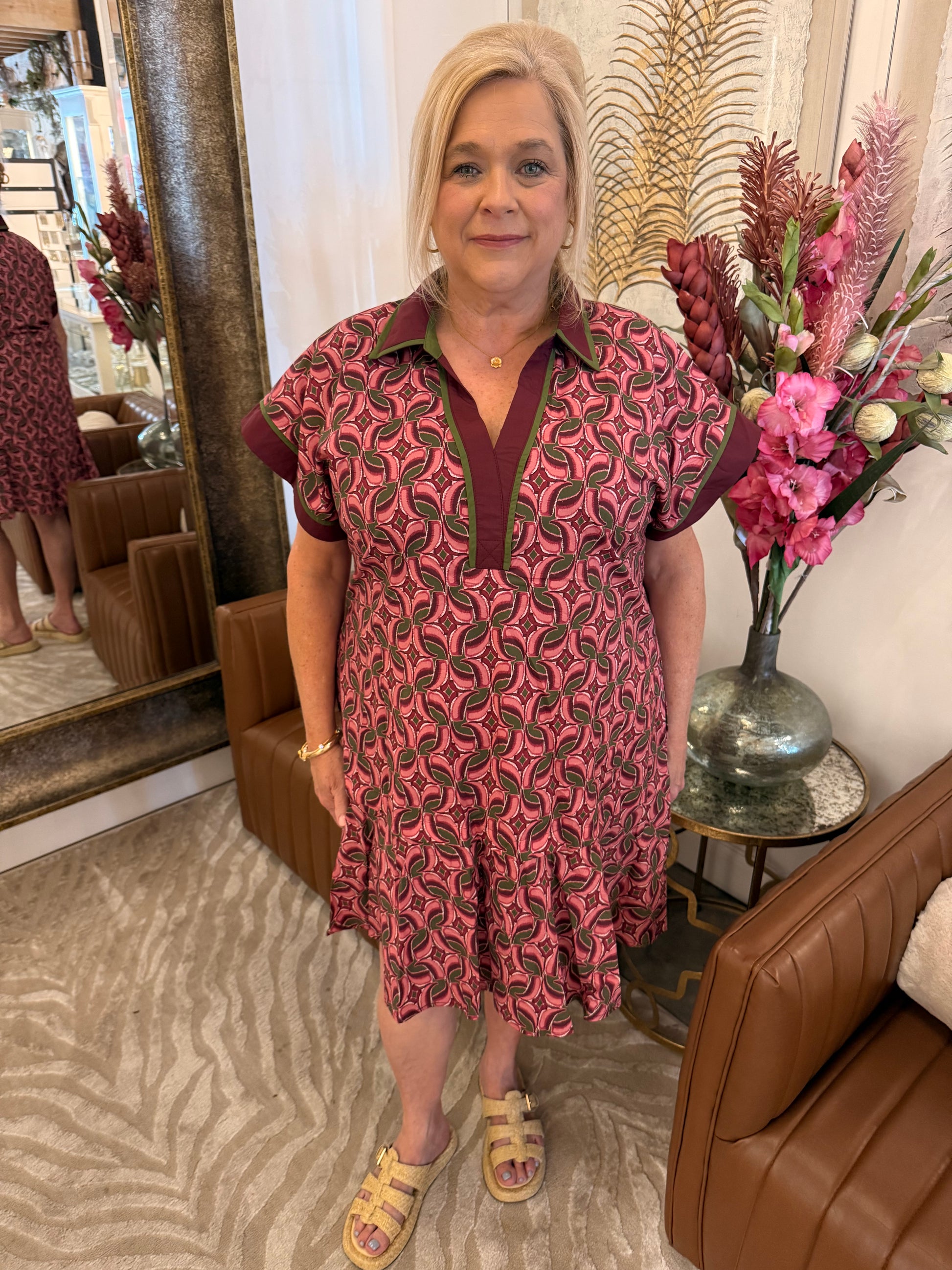 Step into elegance with this vibrant pink and green patterned dress, featuring a flattering V-neckline and playful ruffled hem. Perfect for brunch dates or garden parties, its soft fabric promises comfort and effortless style.