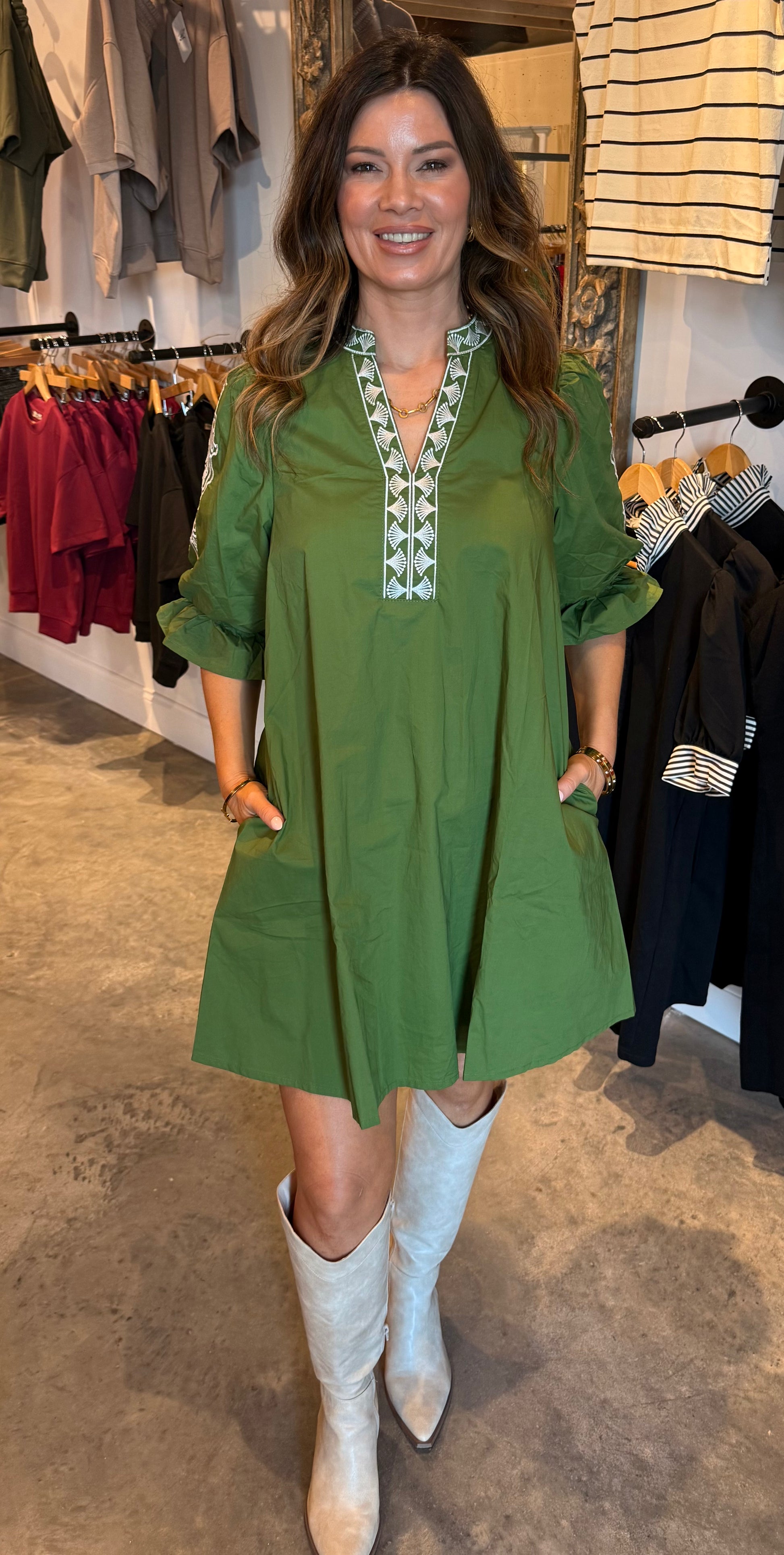 This vibrant green dress features intricate white embroidery along the neckline, offering a playful yet sophisticated look. Its relaxed silhouette and soft fabric make it perfect for casual outings or weekend brunches.