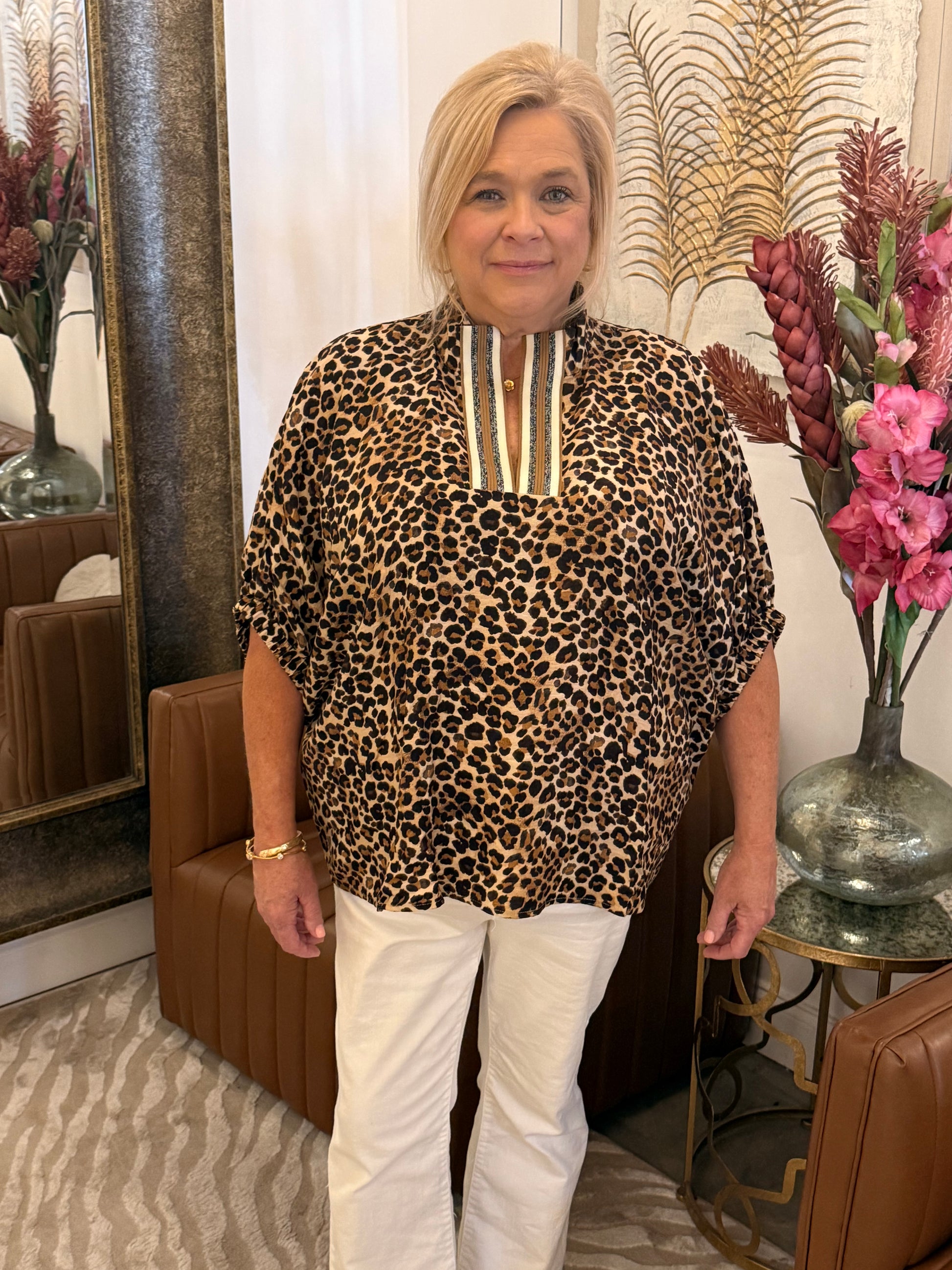 Unleash your wild side with this leopard print top, featuring a relaxed silhouette and eye-catching striped neckline trim. Perfect for casual outings or a night out, its soft fabric ensures comfort while making a bold style statement.