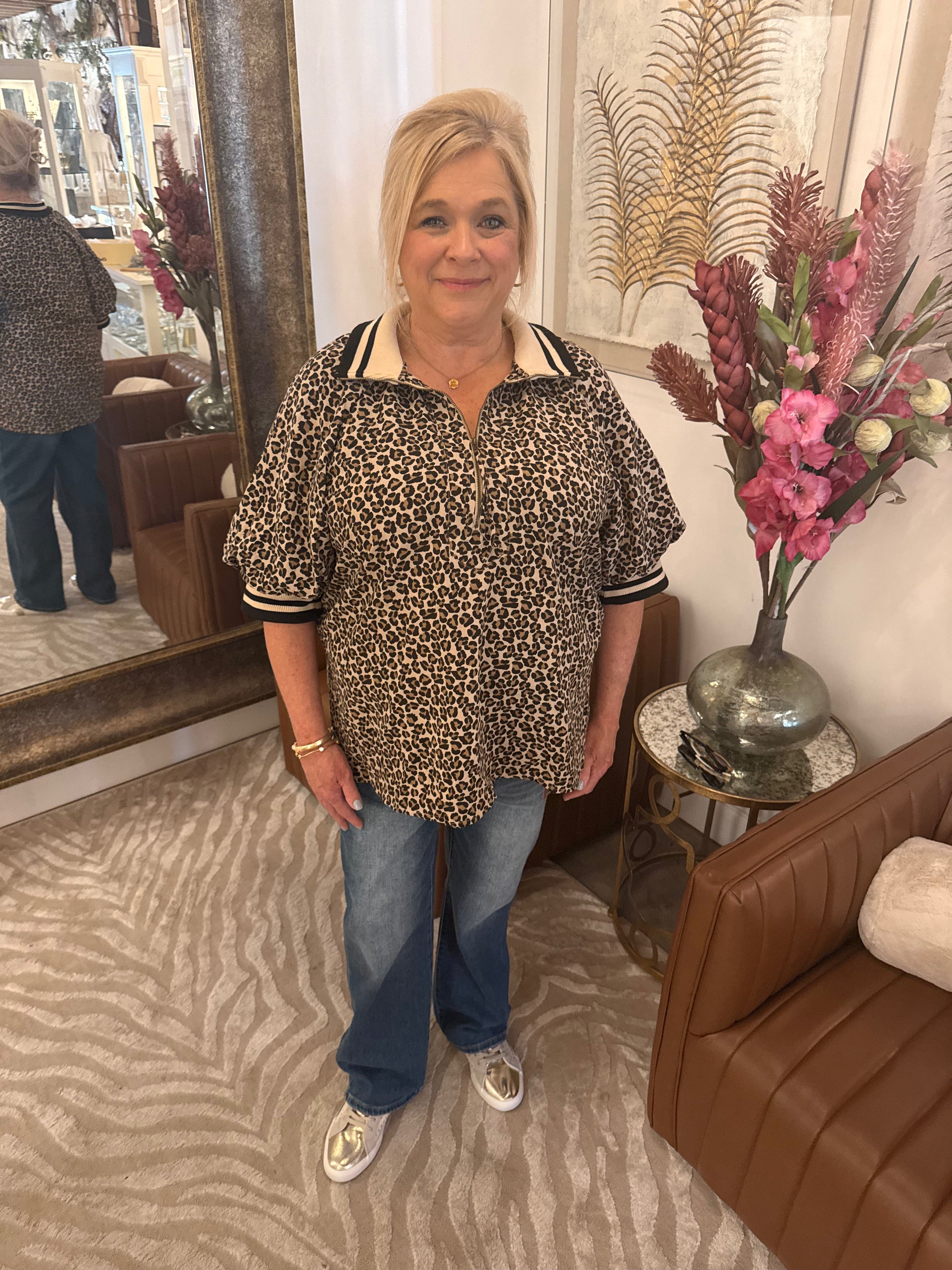 Unleash your wild side with this leopard-print top, featuring playful puff sleeves and a sporty collar. Perfect for casual outings or adding a bold touch to your everyday look.