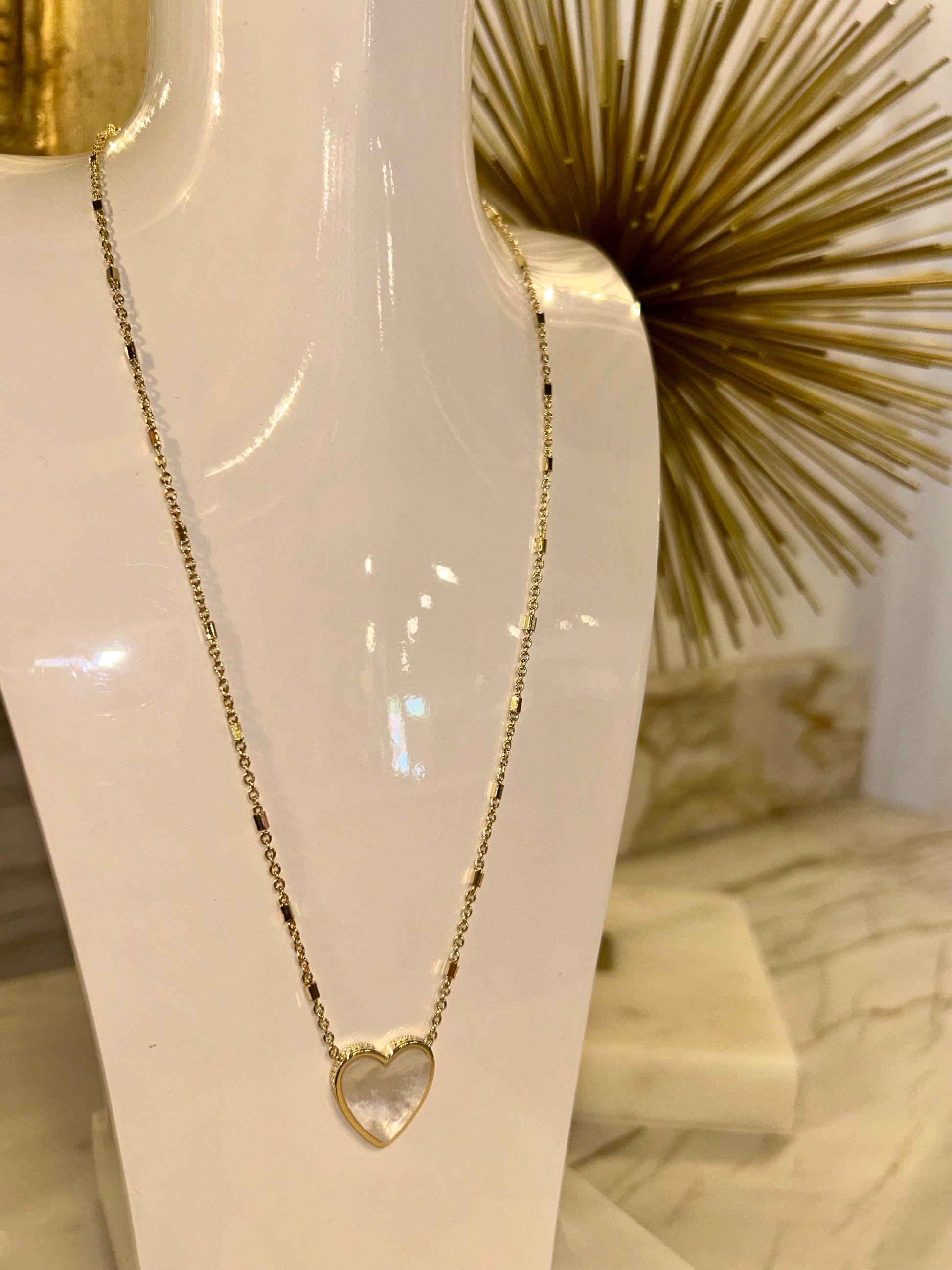 This elegant necklace features a delicate gold chain with a heart-shaped pendant, perfect for adding a touch of romance to any outfit. Ideal for both casual daytime wear and sophisticated evening occasions.