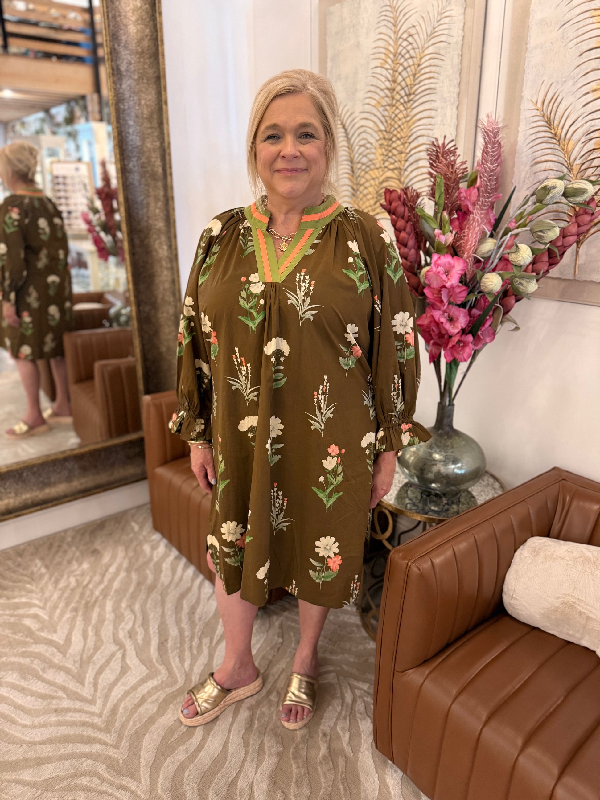 Elevate your wardrobe with this olive green dress, featuring a relaxed silhouette and vibrant floral embroidery. Perfect for casual outings or garden parties, its playful neckline and gathered sleeves add a touch of elegance to any occasion.
