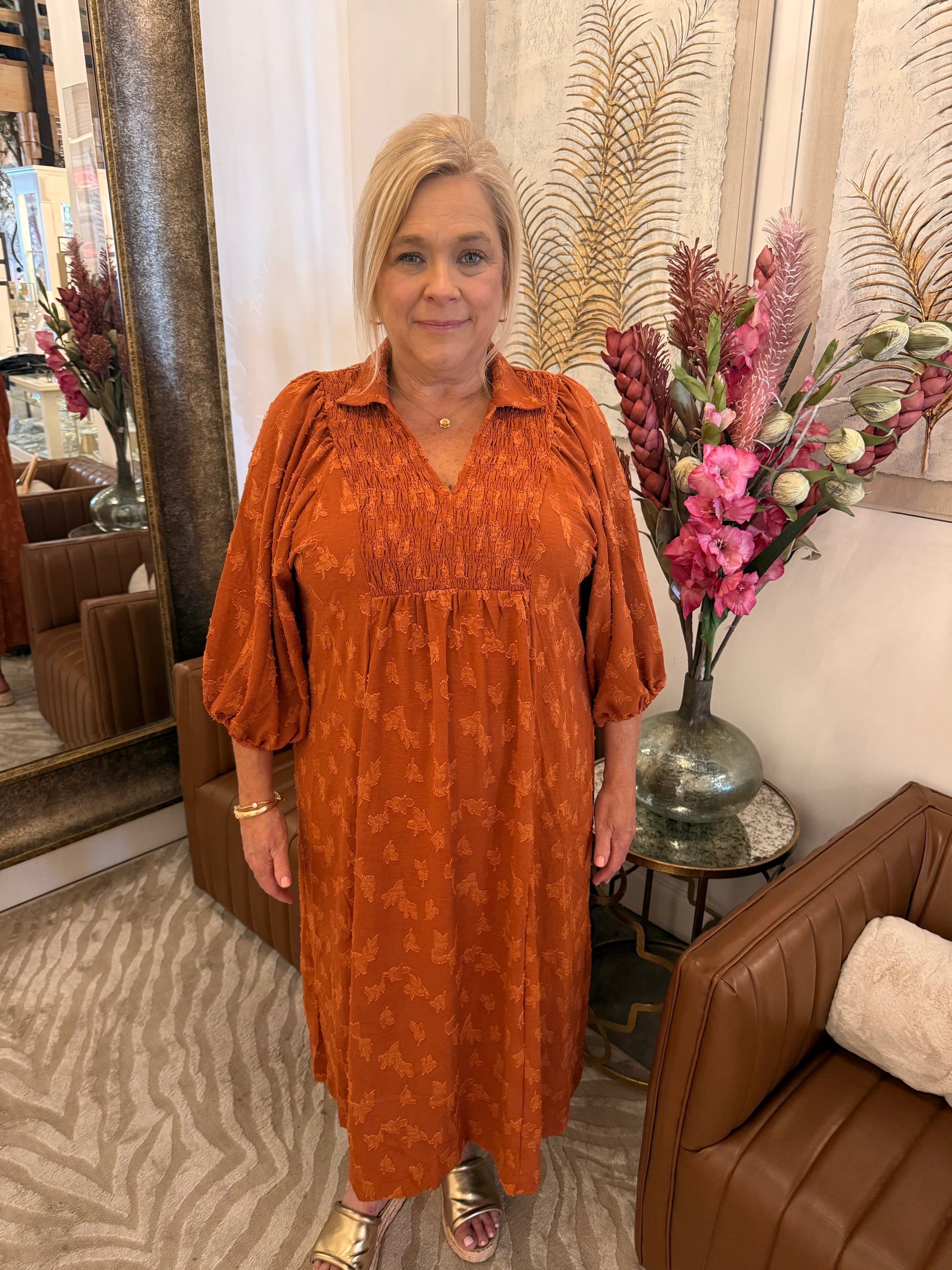 Radiate warmth in this rust-hued, textured dress featuring a flowing silhouette and delicate smocked detailing. Perfect for autumn gatherings or a casual day out, this piece pairs comfort with effortless elegance.