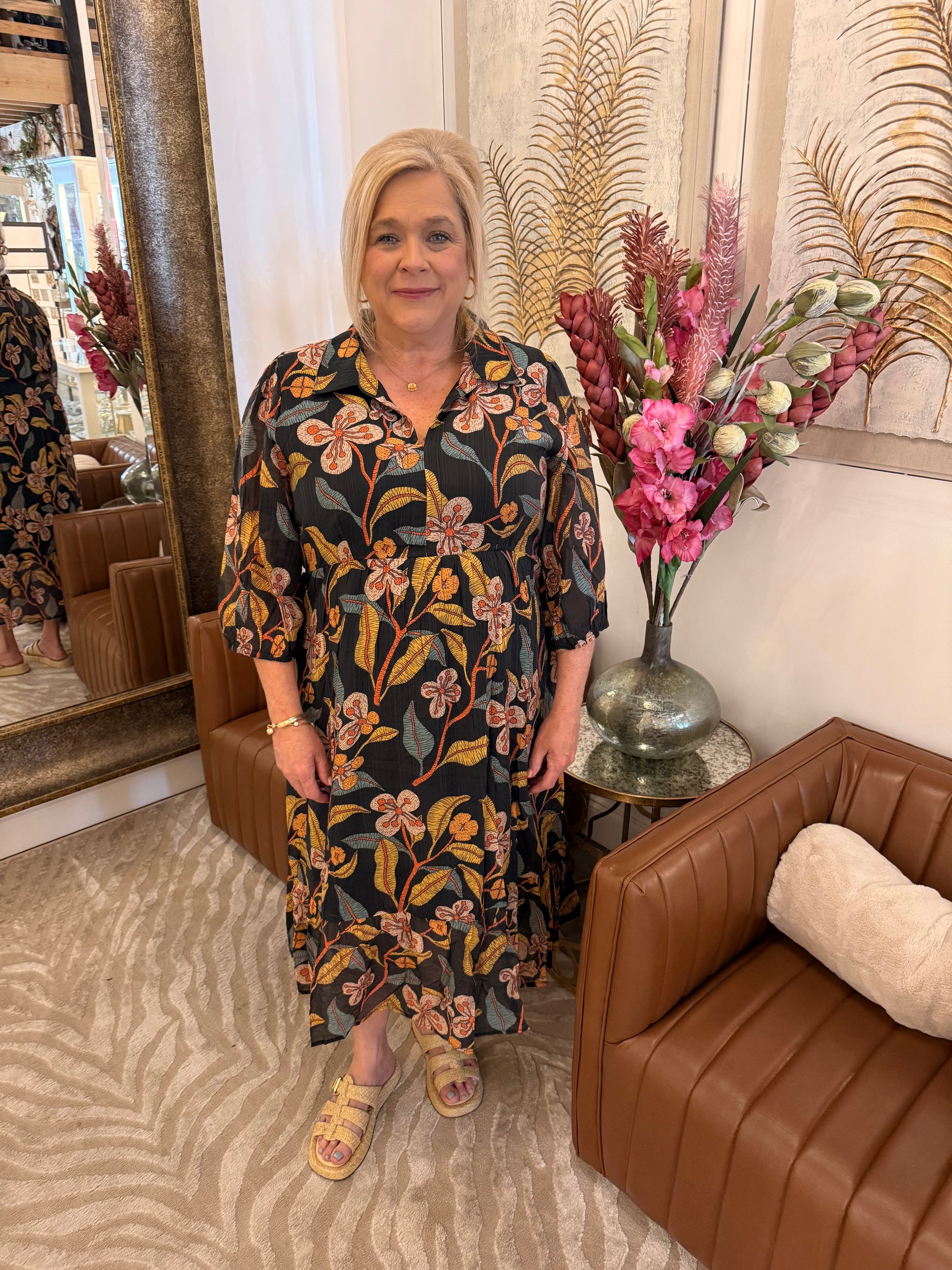 Embrace effortless elegance with this flowing black dress, adorned with vibrant floral patterns and a relaxed silhouette. Perfect for garden parties or casual outings, its lightweight fabric ensures comfort and style in every step.